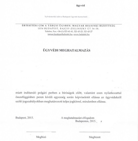 Persze, ha egy bíró netán elfelejtené, hogy kivel is áll szemben egy adott perben a Helsinki a kényelmes helyzete ellenére biztosra megy. Birtokunkba került egy ügyvédi meghatalmazás, amely egyértelműen rámutat, hogy az ügyvéd félreérthetetlenül utal arra, hogy ő a Helsinki Bizottság védelmét élvezi. Mint egy rossz maffia-filmben…