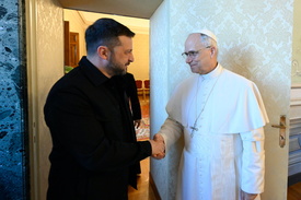 XIV. Leó a pápává választása utáni napokban, május 12-én, telefonon beszélt Volodimir Zelenszkijjel, majd a május 18-i pápai beiktatási misét követően személyesen találkoztak a Vatikánban.