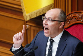 Kijev, 2019. május 22. Andrij Parubij házelnök beszél az ukrán parlament rendkívüli ülésén Kijevben 2019. május 22-én. A parlament az ülésen még csak napirendre sem vette a két napja beiktatott ukrán elnök, Volodimir Zelenszkij egyik beterjesztett törvényjavaslatát sem. Leszavazták a képviselõk, hogy napirendre kerüljön az új államfõ választási törvényt módosító javaslata és a választási folyamat során zajló közbeszerzésekrõl szóló elõterjesztését sem támogatták. Zelenszkij elnök május 20-i beiktatásakor mondott beszédében jelentette be, hogy feloszlatja a parlamentet. MTI/EPA/Szerhij Dolzsenko