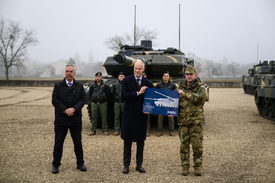 Szalay-Bobrovniczky Kristóf honvédelmi miniszter (k), mellette Ralf Ketzel, a KMW-NEXTER Defense Systems vezérigazgatója (b) és Böröndi Gábor vezérezredes, a Honvéd Vezérkar főnöke (j) a Honvédelmi és Haderőfejlesztési Program keretében beszerzett Leopard 2A7HU harckocsiflottájának teljessé válása alkalmából rendezett eseményen Tatán 2025. december 12-én