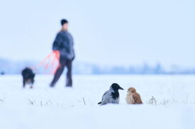 Berlin, 2026. január 8.<br>Ragadozómadár keres táplálékot egy dolmányos varjú közelében egy hótakaróval borított réten Berlinben 2026. január 8-án.<br>MTI/AP/Ebrahim Noruzi