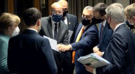 A Facebook-ra feltöltött videóban látható, ahogy Orbán Viktor, Mateusz Morawiecki lengyel miniszterelnök, Angela Merkel német kancellár, Emmanuel Macron francia elnök, Mark Rutte holland kormányfő és Charles Michel, az Európai Tanács elnöke egyeztetnek.