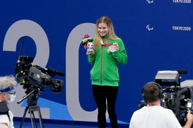 Az ezüstérmes Pap Bianka a 200 méteres női vegyesúszás S10-es kategóriájának eredményhirdetésén a világméretû koronavírus-járvány miatt 2021-re halasztott 2020-as tokiói paralimpián a Vizes Központban 2021. szeptember 3-án