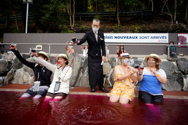 Francia újbort, Beaujolais nouveau-t önt egy sommelier a medencébe a Hakone-hegységben fekvő Hakone Kovakien Junesszun gyógy- és élményfürdőben, ahol a boros termálvízben lubickoló fürdőzők az ez évi újbor árusításának megkezdését ünneplik 2021. november 18-án. Az új Beaujolais-t mindig november harmadik csütörtökjén hozzák forgalomba, és ezt a napot jelentős reklámkampány kíséri Japánban, amely a beaujolais-i újbor egyik jelentős piaca