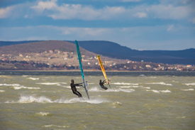 Szörfösök a hidegfronttal érkező erős szélben a balatonfenyvesi szabadstrandnál 2022. február 22-én