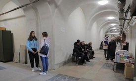 Emberek egy kormányépület pincéjében, amelyet óvóhelyként használnak a nyugat-ukrajnai Lvivet érő orosz támadások miatt 2022. március 21-én