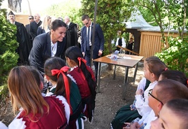 Novák Katalin köztársasági elnök (b) gyerekekkel beszélget a magyarlapádi felújított református templom felszentelése alkalmából tartott istentisztelet előtt 2022. május 20-án