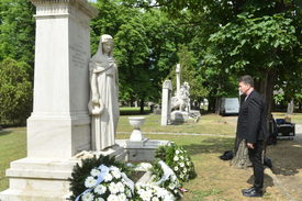 Móczár Gábor, a Nemzeti Örökség Intézetének főigazgatója koszorúz Hauszmann Alajos sírjánál az építész születésének 175. évfordulója alkalmából tartott megemlékezésen a Fiumei úti sírkertben 2022. június 9-én