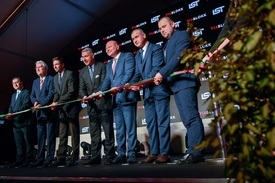 Balázs Attila, a Bayer Construct Zrt. elnök-vezérigazgatója (j2), Lázár János építési és közlekedési miniszter (k), Magyar Levente, a Külgazdasági és Külügyminisztérium parlamenti államtitkára (b3) és Vitányi István fideszes országgyűlési képviselő (b2) a Bayer cégcsoporthoz tartozó Innoscitech Kft. pórusbetongyárának átadásán Biharkeresztesen 2023. május 8-án