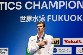 Az aranyérmes Kós Hubert a férfi 200 méteres hátúszás eredményhirdetésén a fukuokai vizes világbajnokságon 2023. július 28-án.