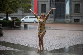 Széttárt kezét a magasba tartva áll a szakadó esőben egy nő Milánóban 2023. augusztus 28-án. Észak-Olaszország számos régióját sújtotta heves esőzés, erős szél és földcsuszamlás az elmúlt napokban.