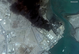A Maxar Technologies műholdfelvételéle lángoló olajraktárokról a jemeni Hudajda kikötővárost ért izraeli légicsapást követően