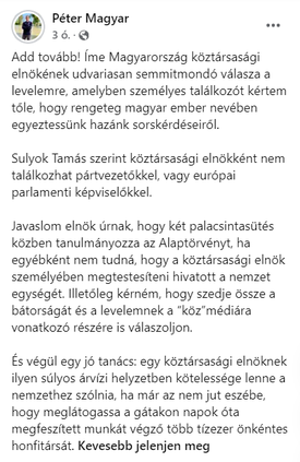 Az államfő válaszlevelében úgy fogalmazott, hogy „a pártpolitikai versenybe a köztársasági elnök alkotmányos helyzeténél fogva nem avatkozhat be”. Ezen sorokat Magyar természetesen „semmitmondónak” nyilvánította.