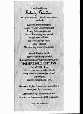 Köszönet Orbán Viktornak, hogy a 2002 márciusi avatóünnepségen miniszterelnökként elfogadta felkérésemet az ünnepség fővédnökeként és velünk meghurcoltakkal mélyen rokonszenvező levélben köszöntötte a kopjafa-állítást: