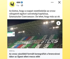 „Az orosz zászlóból formált koreográfiát a ferencvárosi tábor az Újpest elleni meccs előtt” – hazudta vasárnap a 444.hu, a zöld-fehér szurkolók „tettét” azzal magyarázva, hogy a csapat vezetőedzője az orosz Sztanyiszlav Csercseszov, „de lehet, hogy más az ok”.