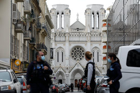 Rendőrök a nizzai Notre-Dame-bazilikánál elkövetett késes támadás helyszínén