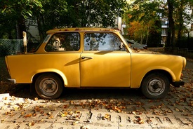 Hirtelen rángatni kezd a kocsi, a motor pöfög, füstöl, fura hangja van. Lehúzódik az út szélére, kiszáll. Döbbenten nézi a vastag füstfelhőt okádó, köhögő kis mecsboxot. Kibetűzi a feliratot: Trabant.