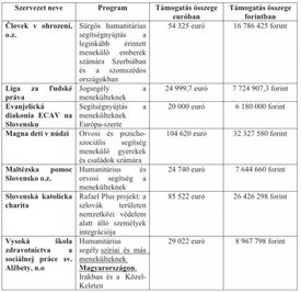 Az Open Society Foundation szlovák irodája „Call for humanity” címmel a Szlovákiában és Szlovákia határain kívül élő menekültek (Kelet-Balkánon érkezők) körülményeinek javítására írt ki pályázatokat migrációs projektekre. Az első felhívás a 2015 októbere és 2016 áprilisa közötti időszakra szólt. Ebben az intervallumban az alábbi szervezeteket és projekteket támogatták, az összegeket euróban és forintban adjuk meg: