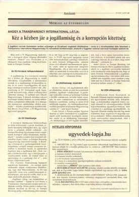 4./ Mindeközben a Budapesti Ügyvédi Kamara sem tétlenkedik, hogy helyes irányba terelje a nemzet fővárosában az ügyvédek gondolkodásmódját. A januári és februári lapszámban is kizárólag a Transparency International véleményét és javaslatait olvashatták a fővárosi ügyvédek.