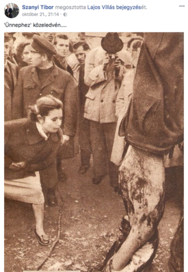 Erre a terepre csúszik rá Szanyi Tibor is most elhangzó magyarázkodásaiban. Ezek szerint mindaz, ami október 28-ig történt, olyan sikeres függetlenségi harc volt, amit Nagy Imre és környezete vezetett, ami utána következett, az pedig már csak a csőcselék őrjöngése. Szanyi most azt mondja, hogy a Köztársaság téri pártház ostroma, illetve a pártház előtti lincselés miatt tette ki posztjában az inkriminált idézőjelet. Mert amit a megvadult tömeg tett, arra már nem lehet az ünnep fennköltségével emlékezni.