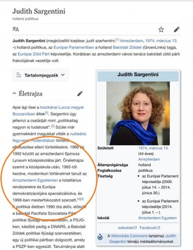Az úgynevezett Sargentini-jelentésről szóló szavazást követően elindult egy módosítási hullám a leköszönő EP-képviselő végzettségére vonatkozó adatok tekintetében.Judith Sargentiniről egy interjúból megtudhattuk, hogy szereti Magyarországot, sokszor járt hazánkban nyaralni és bort inni. Állítása szerint magyar témájú könyveket is olvasott már, még történészként.
