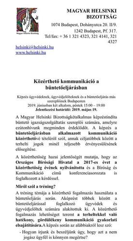 Az érzékenyítés új megfelelője, úgy tűnik, a kommunikációs tréning lett. A soron következő projekt keretében a Magyar Helsinki Bizottság kétalkalmas képzést indít a büntető igazságszolgáltatás szereplői számára júniusban. A képzés a büntetőeljárásban alkalmazott kommunikáció közérthetővé tételéről szól, annak célja többek között a terhelti jogok minél teljesebb érvényesülésének elősegítése.