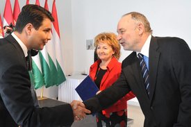 Mesterházy Attila, a Magyar Szocialista Párt elnöke (b) átadja a Szabad Sajtó-díjat Németh Péternek, a Népszava főszerkesztőjének (j) a budapesti A38 Hajón 2013. április 9-én. Középen Láposi Elza, a Népszava kiadójának ügyvezető igazgatója