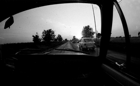 Amikor aztán ahhoz az enyhe balkanyarhoz értünk, ahol pontosan húsz év múlva az árok és három fa segítségével totálkárosra töröm majd a kocsimat, valami tompa puffanást hallottunk az első lökhárító jobboldaláról.