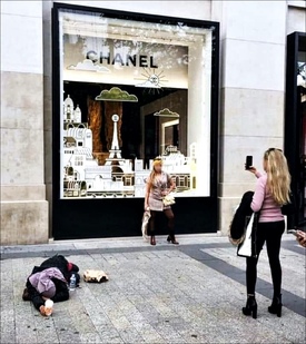 Az igazság ugyanis az, hogy pontosan azt látunk, amit akarunk. S azt akarjuk látni, amit láttatni akarnak velünk. A fenti kép elkészítéséhez ugyanis nincs szükség másra, mint egy négyfős társaságra, egy helyszínre, na meg egy fényképezőgépre. Egy nő a kirakathoz áll, egy másik nő fotózza őt, harmadik társuk az utca kövén fekszik szakadt ruhában, a negyedik pedig – miután beállította a kompozíciót – elkészíti a fényképet. Aztán ez a bizonyos fotó már mehet is fel valamelyik közösségi oldalra, hogy ott mindenki ellássa megfelelő számú könnyezős hangulatjellel.