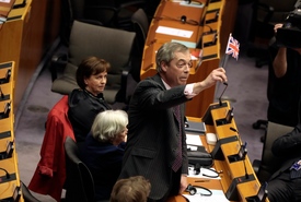 Utolsó európai parlamenti beszéde végeztével párttársaival – a néhány nappal ezelőtt hozott új szabályra utalva – kis brit zászlókat lengetve búcsúztak.