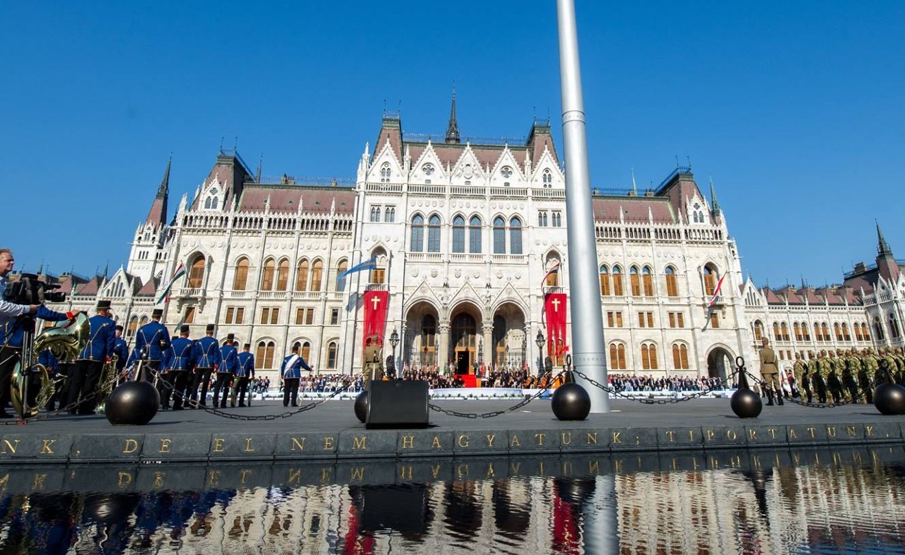 2021.03.15. Felvonták a nemzeti lobogót az Országház előtt Katonai tiszteletadás mellett felvonták a nemzeti lobogót az Országház előtt a március 15-ei nemzeti ünnepen.