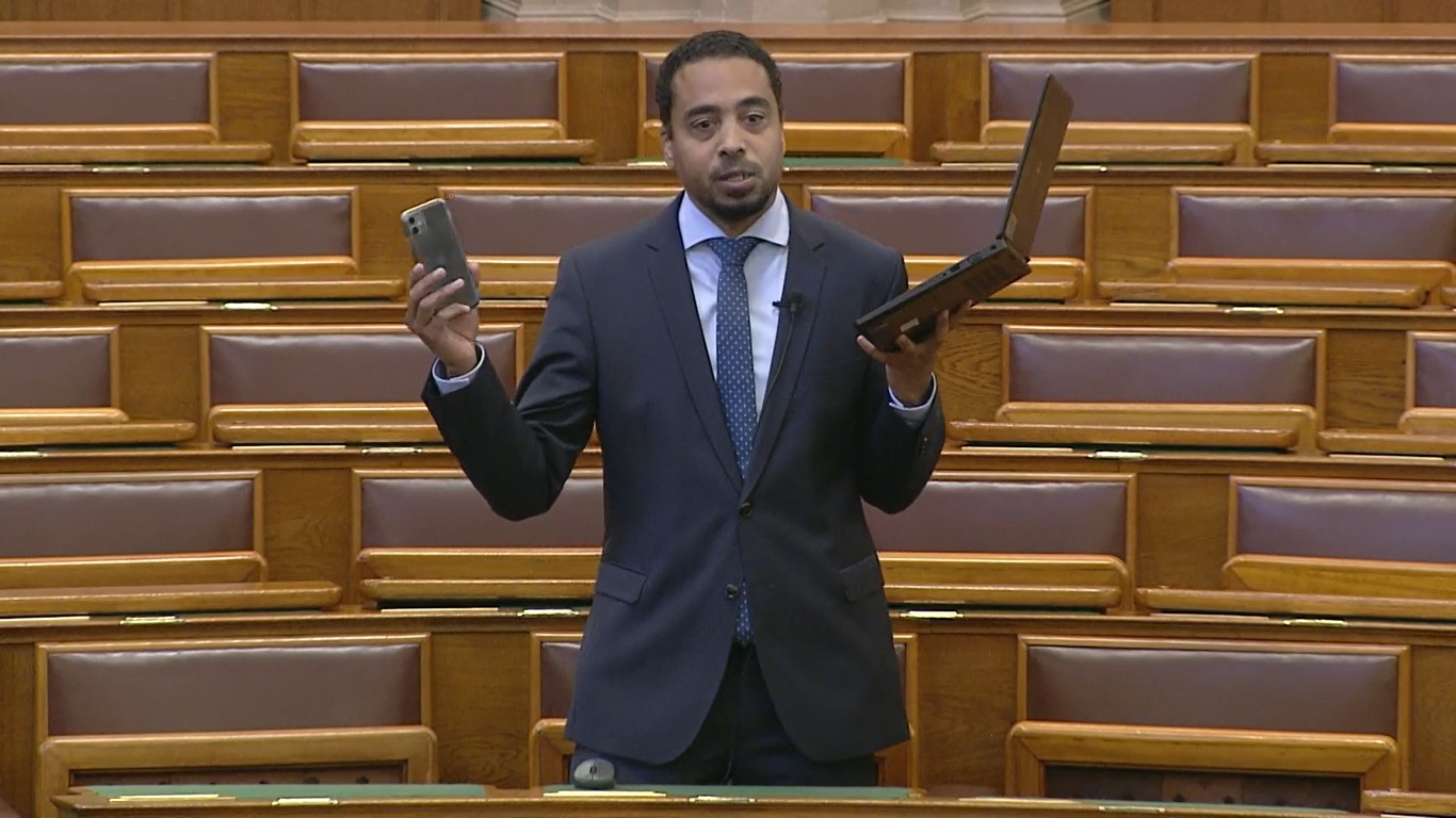 2021.10.04. Kocsis-Cake Olivio a mobilját és a laptopját mutogatta a parlamentben Kocsis-Cake Olivio felszólalását azzal kezdte, hogy feltartotta okostelefonját és laptopját. Videóval!