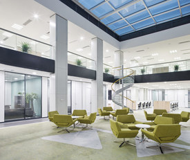 Még rosszabb a helyzet, ha a cég élőhelye egy ma divatos üvegfalú irodaházban található. Ezek felépítése olcsóbb ugyan, mint egy beton- vagy téglaépületé, viszont a legcsekélyebb mértékben sem felel meg az emberi viselkedés évezredek alatt kódolt szabályainak. Konrad Lorenz etológus szerint ugyanis az idegrendszerünk tekercselése jottányit sem változott barlanglakó ősember korunk óta. Akkor érezzük magunkat komfortosan, ha napi tevékenységünket védett körülmények között folytathatjuk. Az üvegfalak pedig nem nyújtanak olyan védettséget, mint amilyet belénk kódolt ösztöneink igényelnek. Az üvegfalon túl tátongó szakadéktól persze többnyire megvédik magukat a dolgozók. A beköltözés után néhány hét alatt megjelennek az üvegen túli világot legalább optikailag kizáró szekrények, tömött polcok, egymásra halmozott fiókok. Az őszi ónos esőktől vagy az égető nyári napsütéstől azonban nehéz megvédeni érzékeinket: a belénk ivódott tapasztalatok rendszerint erősebbek a légkondicionáló hűvösénél, a fűtés melegénél.