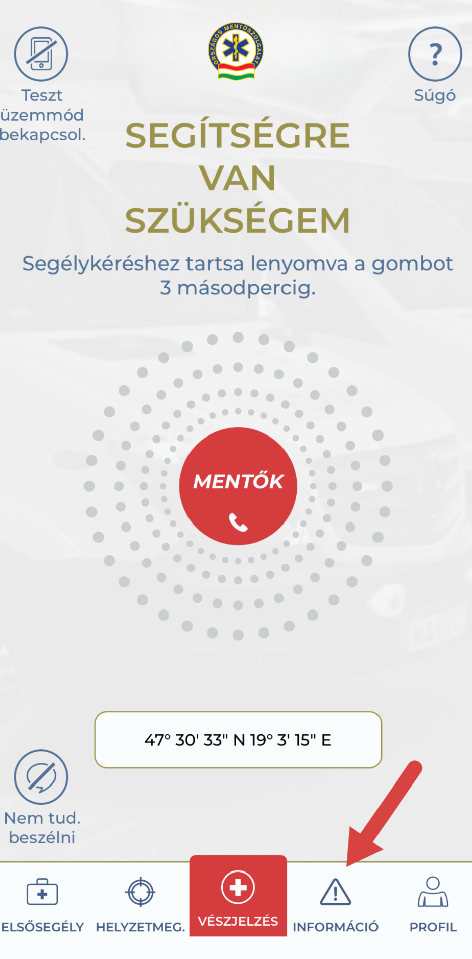 - Segélyhívás egy gombnyomással: három másodpercig megnyomva a vészjelző gombot, az app nemcsak hívást indít, hanem azonnal továbbítja a GPS-koordinátákat és a felhasználó egészségügyi profilját.