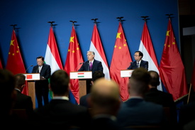 Orbán Viktor miniszterelnök (k), Vang Vej-csung, a kínai Kuangtung tartomány kormányzója (b) és Vang Csuan-fu, a BYD vállalat elnök-vezérigazgatója (j)