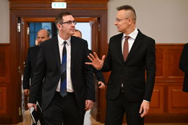 Szijjártó Péter külgazdasági és külügyminiszter (j) és Steven Foster, a Hanon Systems regionális vezetője a cég magyarországi beruházásáról tartott sajtótájékoztatón a Külgazdasági és Külügyminisztériumban 2023. december 15-én