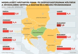 Mindezek alapján a februári statisztikából kitűnik, hogy Budapestet csak Luxembourg előzte meg 1,7 százalékos értékkel. Hajszállal marad el csak ettől a magyar főváros mutatója, az 1,9 százalék. A rangsor harmadik helyezettje Brüsszel, 2,7 százalékos aránnyal. Már ezek is sokatmondó számok, de érdemes egy kicsit leszűkíteni a vizsgálatot a régiónkra, a hasonló gazdasági fejlettségű fővárosokra. E rangsor alapján pedig – csak úgy, mint a földgáz- és az áramtarifákat tekintve – Budapest áll a legkedvezőbb helyen. A következő Bécs, ahol a modellezett háztartás jövedelmének 2,8 százalékát, Zágrábban pedig 3,6 százalékát költik fűtésre és világításra. Ljubljana, Varsó, Pozsony és Bukarest is több mint négyszázalékos értékkel szerepel a listán, Prágában 5,6, Szófiában pedig 6,6 a hatóság által számolt érték.