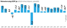 Valójában azonban Németország leg­alább egy évtizede nem találja saját útját. Míg a hetvenes években 3-6 százalék közötti bővülés jellemezte a német gazdaságot, az ezredforduló után ez már 1-3 százalék környékére csökkent. Bár a 2009-es nagy visszaesés után dinamikusan pattant vissza a német GDP – így Németország azon kevés államok egyike, amelyik összességében pozitív szaldóval jött ki a 2008–2009-es válságból –, 2012–2013-ban váratlanul stagnálásba fulladt, majd mérsékelt, két százalék körüli növekedésnél kötött ki. Tavaly pedig újra léket kapott a német gazdaság hajója: a harmadik negyedév váratlanul 0,2 százalékos GDP-csökkenést hozott, amit a negyedik negyedévben csupán 0,02 százalékos növekedés követett. Utóbbi azt jelenti, hogy Németország hajszál híján recesszióba csúszott (statisztikailag ez akkor fordul elő, ha két egymást követő negyedévben csökken a GDP). S nem lett sokkal jobb az idei első negyedév sem a maga 0,4 százalékos eredményével. A második negyedévre még nincsenek hivatalos adatok, de egy júniusi Bundesbank-prognózis újabb visszaesést valószínűsített, tekintettel arra, hogy az áprilisi ipari termelési adatok négyéves mélypontot mutattak.