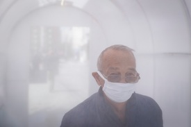 A koronavírus-járvány elleni védekezésképpen felállított fertőtlenítő-alagúton megy keresztül egy férfi Mitrovicában 2020. április 7-én
