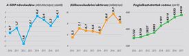 GDP. Hat éven át tartó csökkenés vagy stagnálás után 2012-től újra nő Magyarország GDP-je. Azóta a legjobb év 2014 volt, ami 4,2 százalékos növekedést hozott, figyelemre méltó azonban, hogy 2016, amikor a gazdaság – a két uniós ciklus közötti folyósítási szünet miatt – nélkülözni volt kénytelen az uniós forrásokat, szintén 2,2 százalékos bővülést mutatott. Tavaly, immár újra az uniós forrásokkal kiegészülve, 4,1 százalékkal nőtt a GDP.