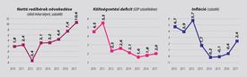 Kiegyensúlyozott költségvetés. A családbarát és foglalkoztatásösztönző támogatásokkal együtt is Magyarország költségvetési hiánya hetedik éve teljesíti a 3 százaléknál kisebb deficitre szóló uniós előírásokat. Sőt, az elmúlt négy évben a hiány mértéke alig érte el, vagy nem is érte el a 2 százalékot. A költségvetési egyensúlyt alapvetően a növekvő foglalkoztatásból eredő többletbevételek biztosítják, de jelentős szerepet játszik az adóhivatal informatikai fejlesztéseiből (online pénztárgépek, fuvar-nyomonkövetés) adódó gazdaságfehérítés is.