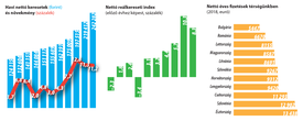 A táblázatok ugyanakkor azt is mutatják: Magyarországon a negyedik legalacsonyabb a nettó bérszínvonal az Európai Unióban, és ez különösebben nem változott az elmúlt években. A hosszú idősorokból pedig kiderül: hazánk már a kilencvenes évek nagy leértékelési hullámaiban elveszítette bérelőnyét a szomszédos országokkal szemben, és már az unióba is a negyedik legalacsonyabb átlagbérrel lépett be 2004-ben (és a lengyelek 2005-ben már meg is előzték hazánkat). A szlovákokkal és lengyelekkel szembeni jelentős leszakadást pedig 2006–2008 között szenvedük el, amikor az ikerdeficit és eladósodás szorításában befulladt a magyar gazdaság, miközben például Lengyelországban évi 15 százalékkal emelkedtek a fizetések.
