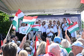 Magyar Péter, a Tisza elnöke a párt kötcsei rendezvényén, mögötte Kármán András