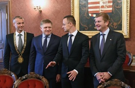 Szijjártó Péter külgazdasági és külügyminiszter és Peter Ziga szlovák gazdasági miniszter látta el kézjegyével az együttműködési szándéknyilatkozatot az Eastring gázvezeték projektről a történelmi városházán Robert Fico szlovák miniszterelnök jelenlétében.