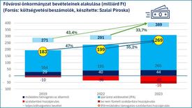 a tavalyi teljes költségvetési bevétel 389 milliárd forint volt; 98 milliárd forinttal, azaz harmadával (33,7 százalékkal) nőtt a 2022. évihez viszonyítva.