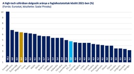 Szalai Piroska cáfolja azt a közkeletű vélekedést is, hogy kizárólag a járműgyártás területén léptünk volna előre. A high-tech szféra előretörése a csúcstechnológiai iparnak és a tudásintenzív szolgáltatásoknak szinte minden területét érinti, és ez megmutatkozik a foglalkoztatási adatokban is. Egyre többen keresik kenyerüket az e területen működő vállalkozásoknál. Európában pedig a negyedik legjobbak voltunk a 2021-ben a high-tech szférában tevékenykedő nagy cégek és kkv-k által foglalkoztatott férfiak és nők arányát tekintve is.