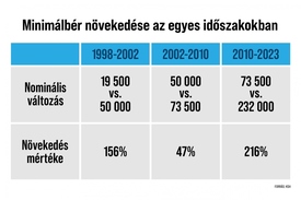 Míg az első Orbán-kormány 1998 és 2002 között két és félszeresére emelte a minimálbért, addig a szocialista-liberális kormányok 2002 és 2010 között mindössze 47 százalékos emelést hajtottak végre. A 2010 utáni időszakban ez a növekedés 216 százalékos.