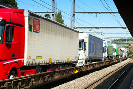Spiez, Switzerland – July 25, 2019: With a rolling highway road trucks take the train to transport their cargo in the mountainous landscape (a number on the truck has been removed to respect privacy)