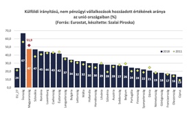 – A foglalkoztatottakat illetően lassan emelkedik a külföldi irányítású cégek aránya, a 2011-es közel 14-ről 2018-ra közel 16 százalékra nőtt. Az arány érthető módon a volt szocialista országokban magas, ahol a rendszerváltás után megjelentek a nagy nyugati cégek, a helybeli régi vállalatok közül sok eltűnt, vagy jobb esetben a márka megmaradt, de külföldi tulajdonos kezében. De például Olaszországban, Németországban alacsony az arány, az előbbinél a munkavállalók 91 százaléka hazai irányítású cégnél dolgozik.