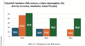 – A 2. táblázat az uniós átlagot, valamint a magyar és a legrosszabb, esetünkben a román adatot mutatja. Jól látható, hogy 2010-ben a magyar lakosság 47,2 százaléka élt túlzsúfolt lakásban, ami akkor a negyedik legrosszabb érték volt az unióban. A radikális csökkenés 2017-ben indult meg, a reálbérnövekedés és a támogatások együttes hatása akkorra érett be. A legfrissebb olyan adatsor, amelyben az unió minden tagja szerepel, 2022-es: a magyar érték 17 százalék, ez már az uniós átlag. A 2023-as magyar érték 15,6, ez már az uniós átlagnál is jobb lesz.
